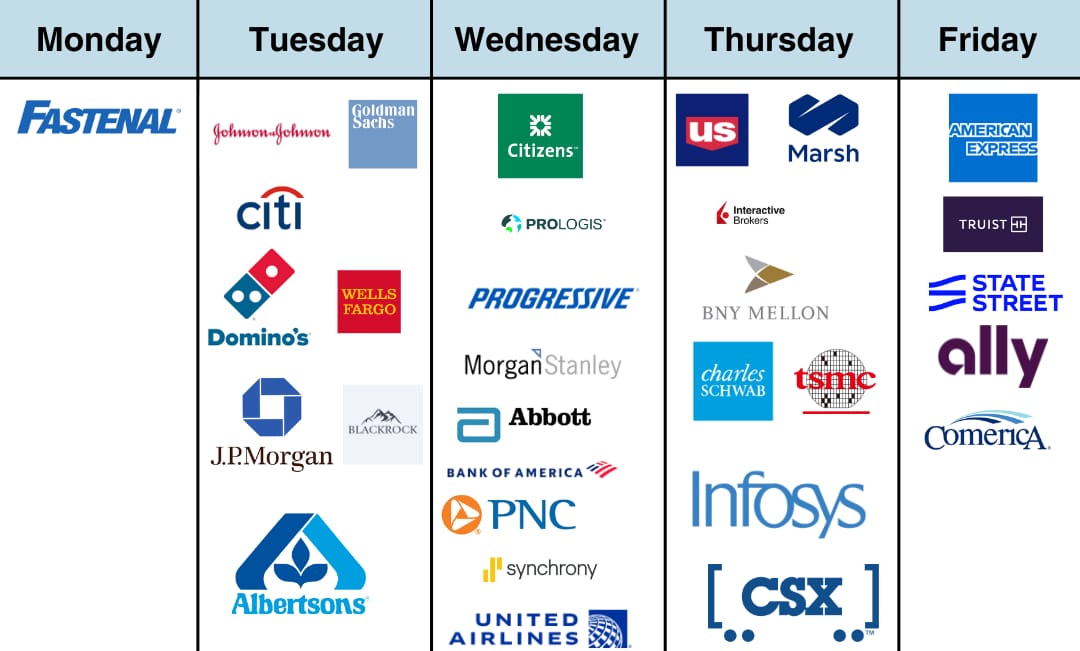 Big banks are up next to face the music. JPMorgan, Goldman Sachs, Wells Fargo, and Citi report earnings Tuesday, with Bank of America and Morgan Stanley following Wednesday. Analysts expect 6% profit growth, but things could get ugly if there are issues.