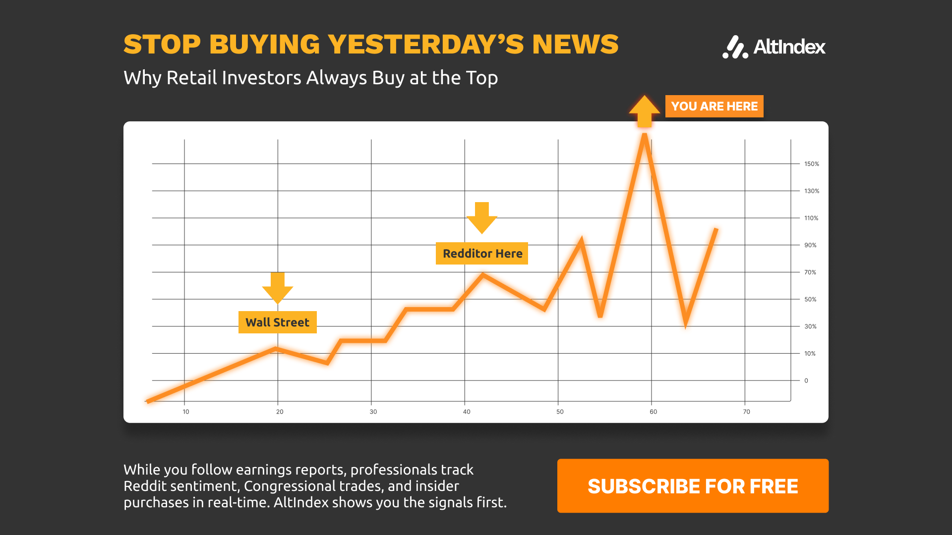 AltIndex tracks Reddit sentiment, Congress trades, hiring trends, and insider activity in real-time. Get alerts when signals spike—before the crowd catches on.