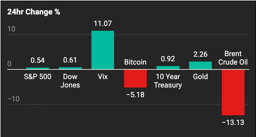 Crypto has fallen again too: Bitcoin is down 6.4% over the last ~10 hours, and Ethereum is down 7.3% over the same time period.