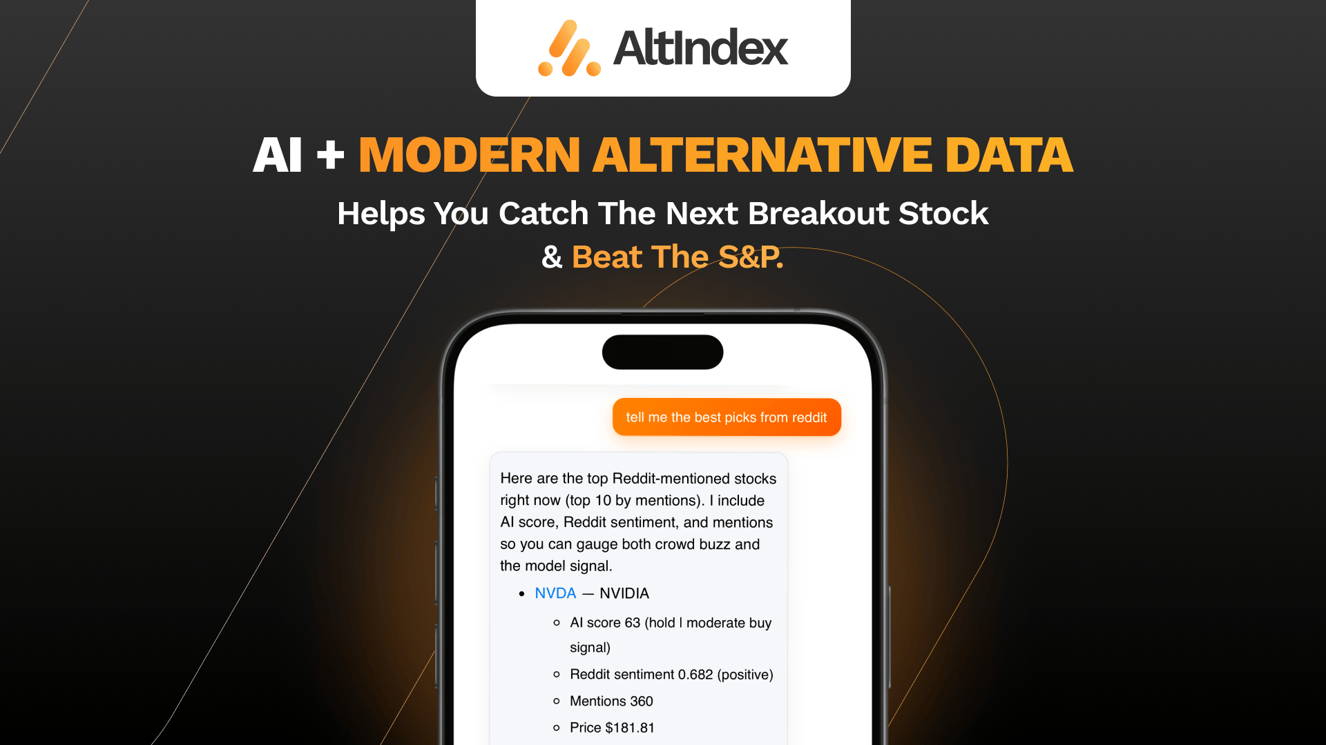 AltIndex is running their Black Friday + Cyber Monday deal for half-off market signals, stock ratings, and unlimited data sets.