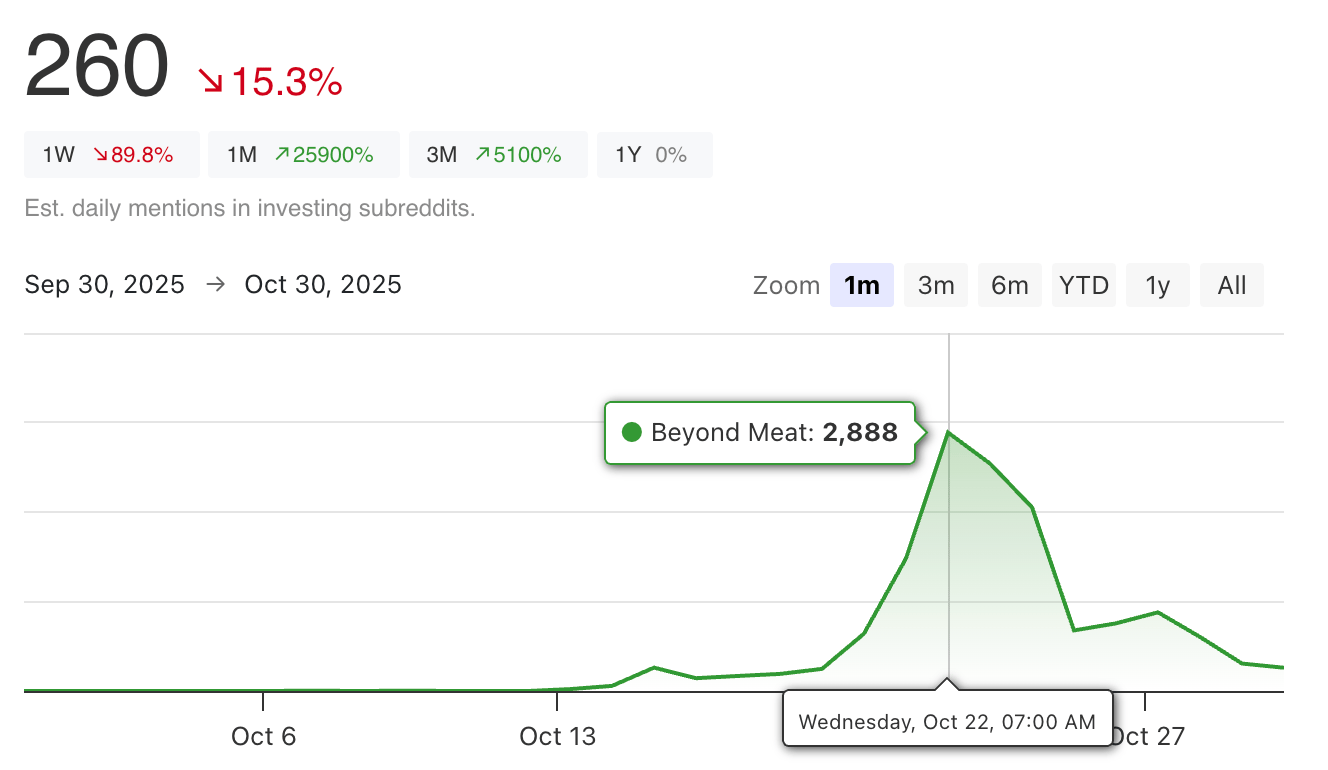 And sometimes the Reddit spike is an early signal of a real move. Palantir up 139% (over time). Nebius up 104% (fairly fast). Even the meme stock extremes like Beyond Meat's 647% gain (just 10 days) started with a surge in social discussion.