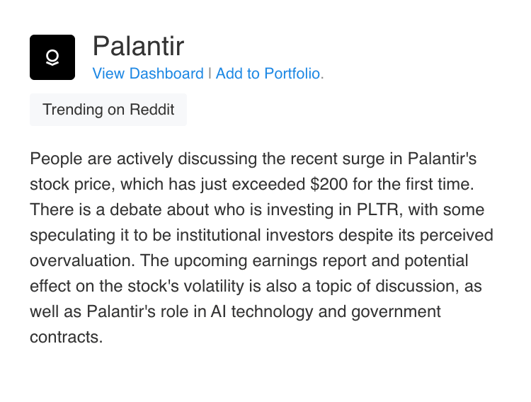This gives you actionable context. Palantir wasn’t just being mentioned more; there was a specific catalyst (crossing $200), a debate about institutional buying, and anticipation around earnings. That's information you can research and trade on.