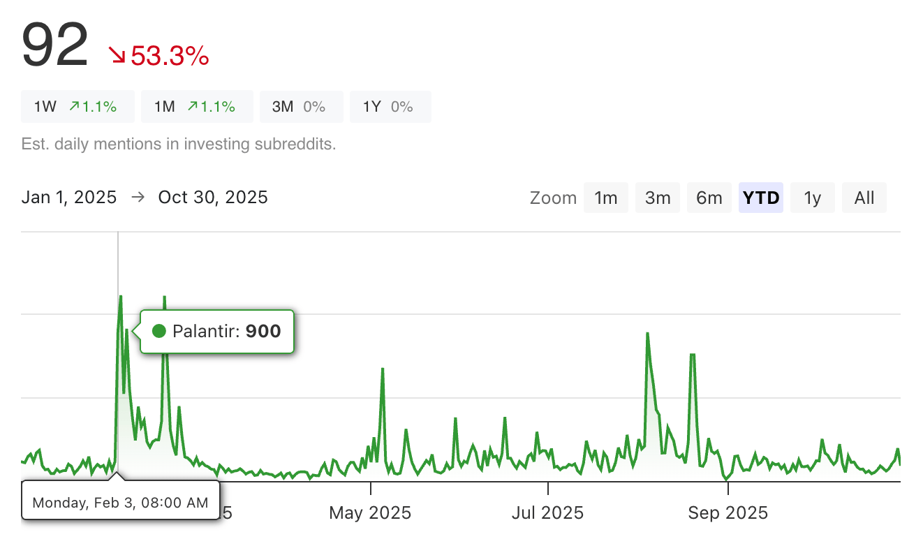 Reddit mentions spiked 669% in a single day. Over the next two weeks, the stock's price rose 49%. Today, PLTR is up 139% since that February spike.